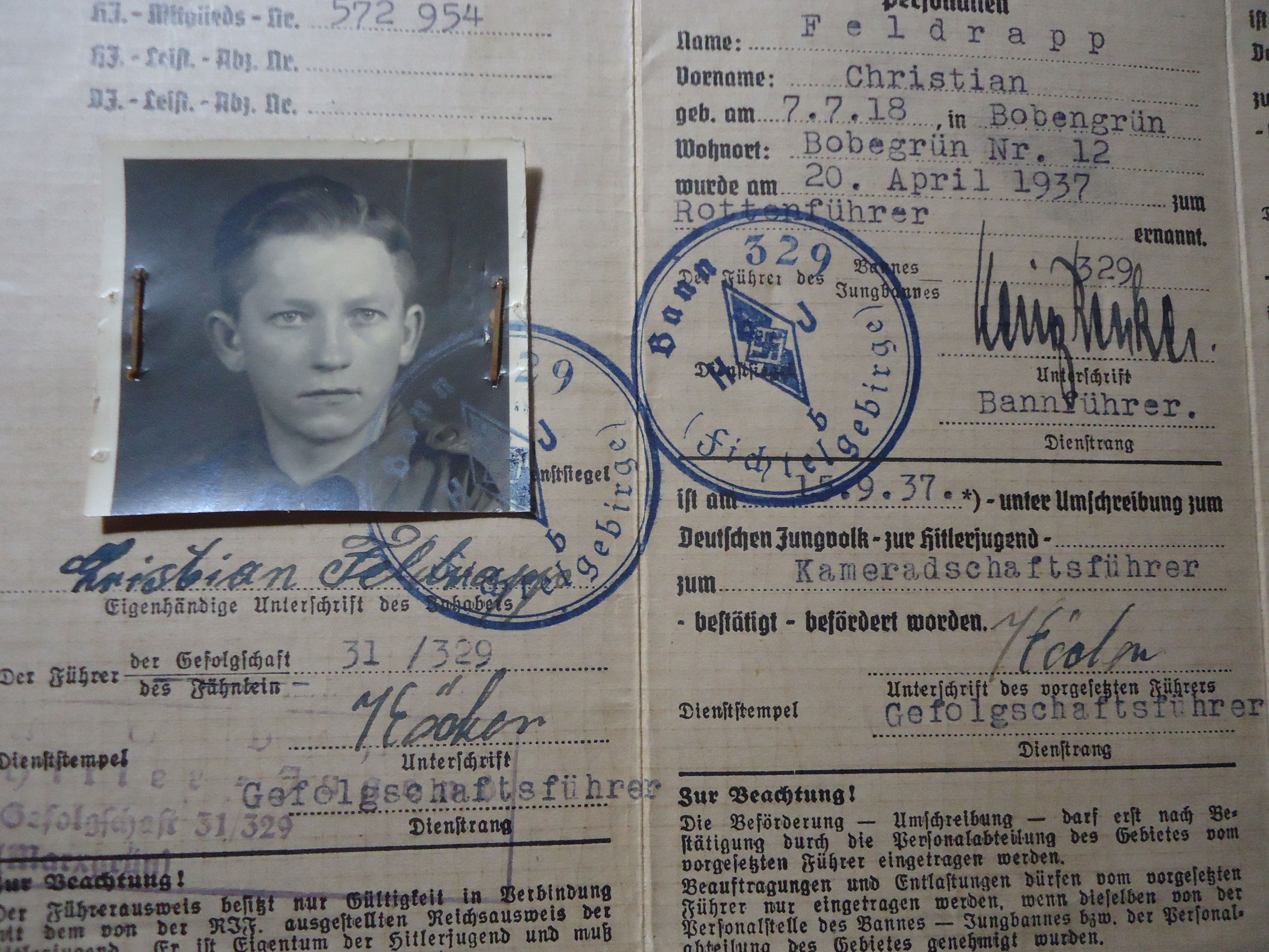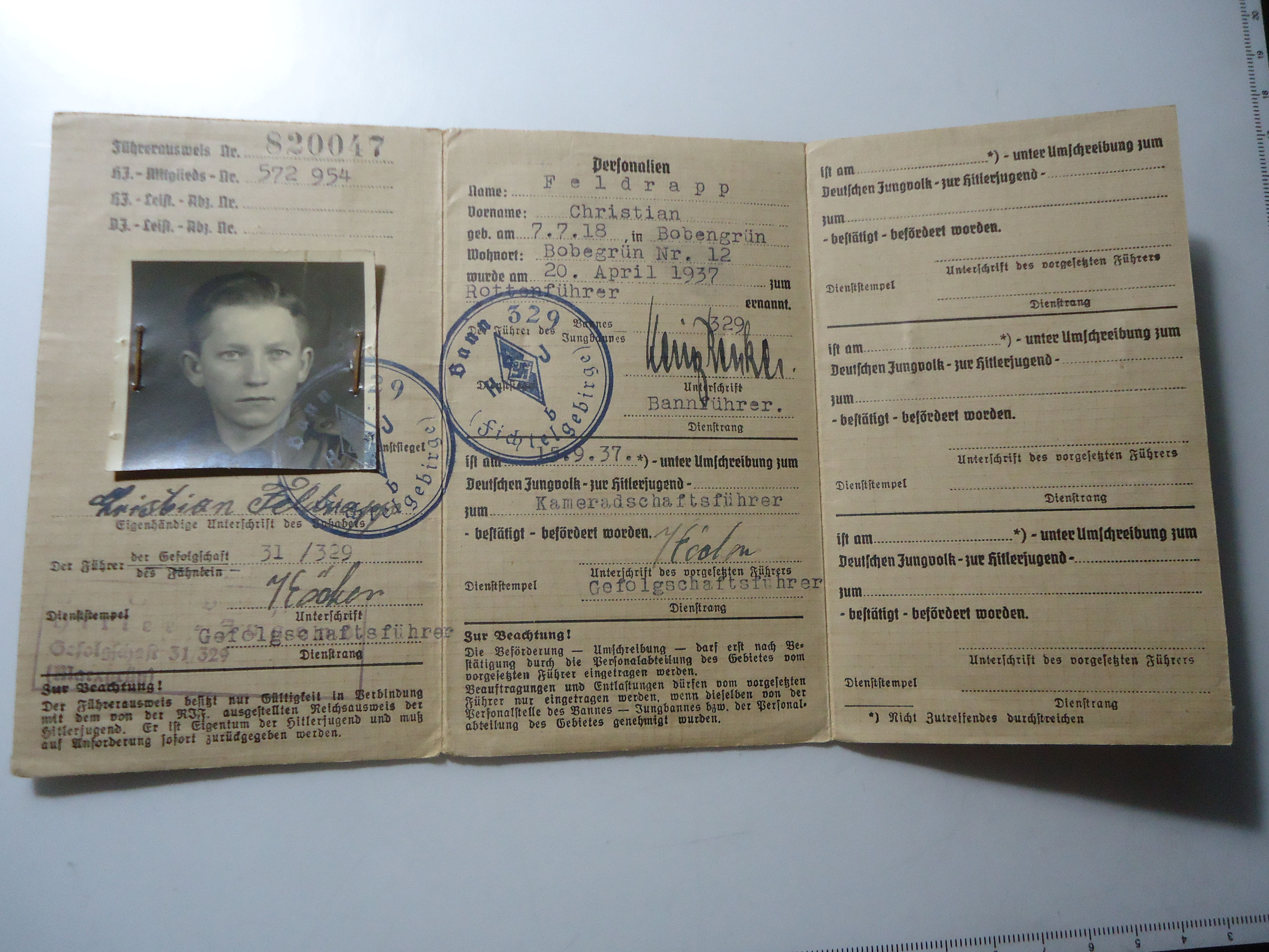 Very clean HJ ID Card to Rottenfuhrer CHISTIAN FELDRAPP Born 1918 nice photo, near mint ID card