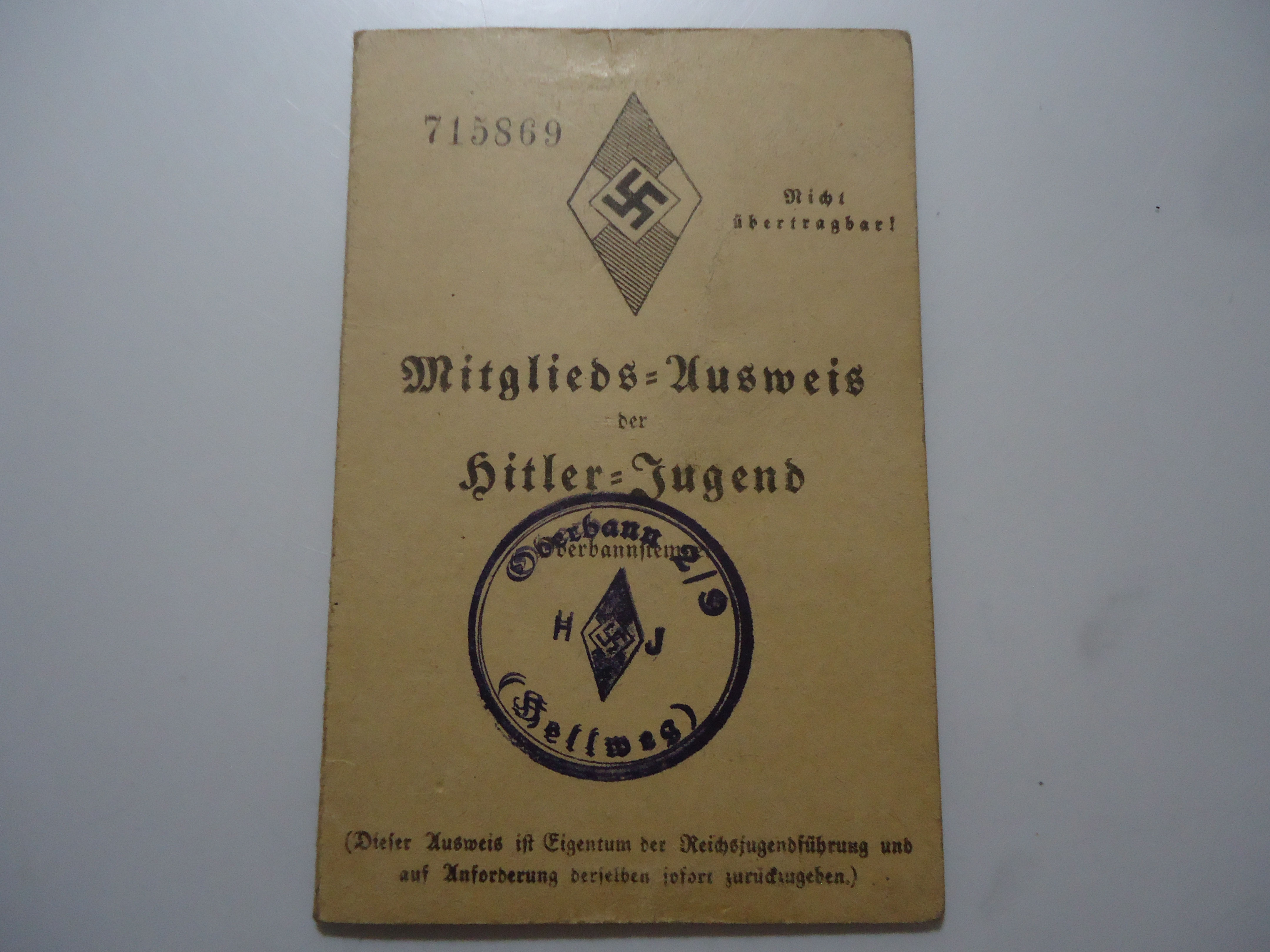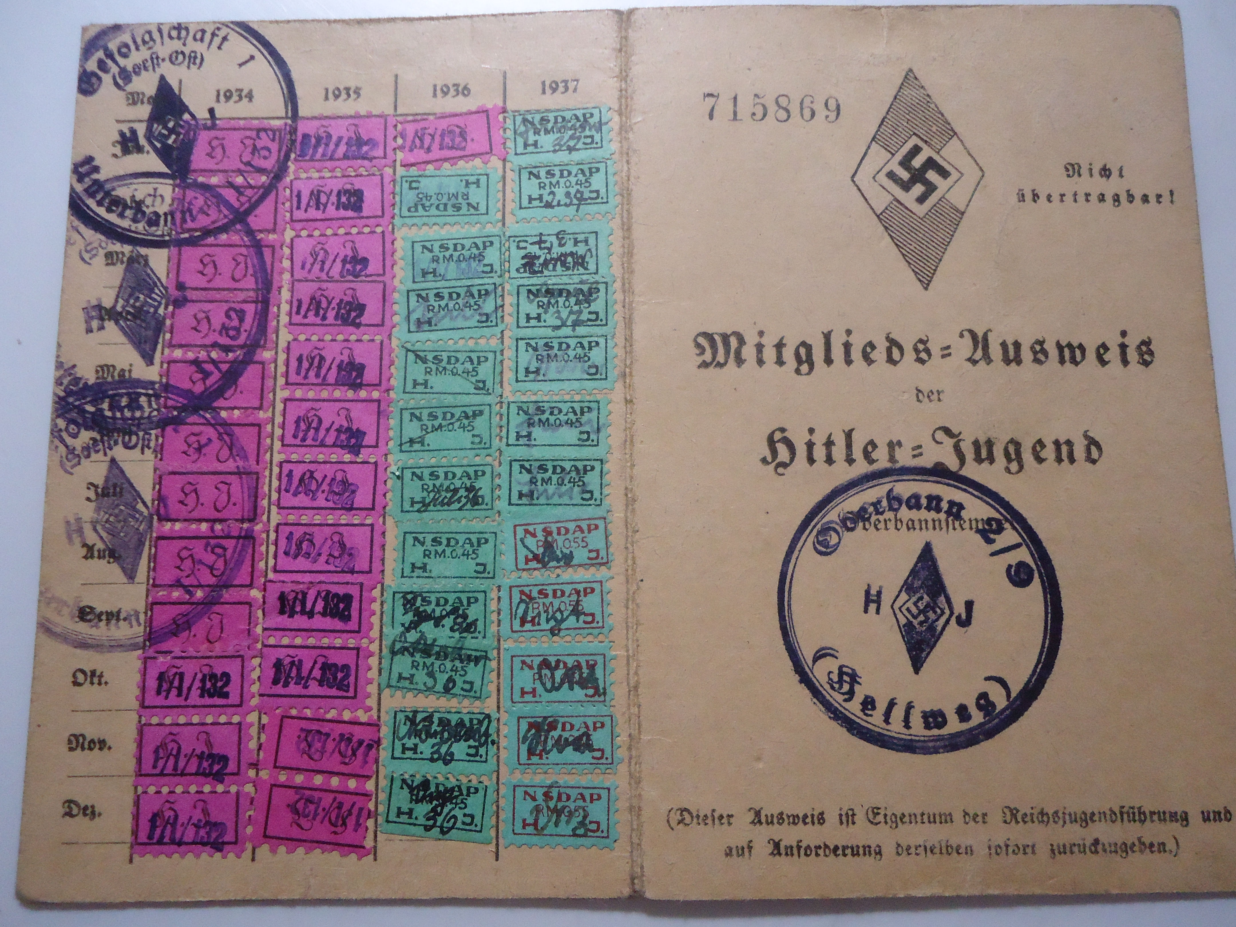 14 R OLD WILLI POTHMANN, BORN 1919, ISSUED 1933, GREAT PHOTO WITH ARMBAND AND MEMBER PIN ON HIS UNIFORM, VERY NICE MITGLIEDS/AUSWEISS RARE, VG PLUS STAMPS FROM 1934-37