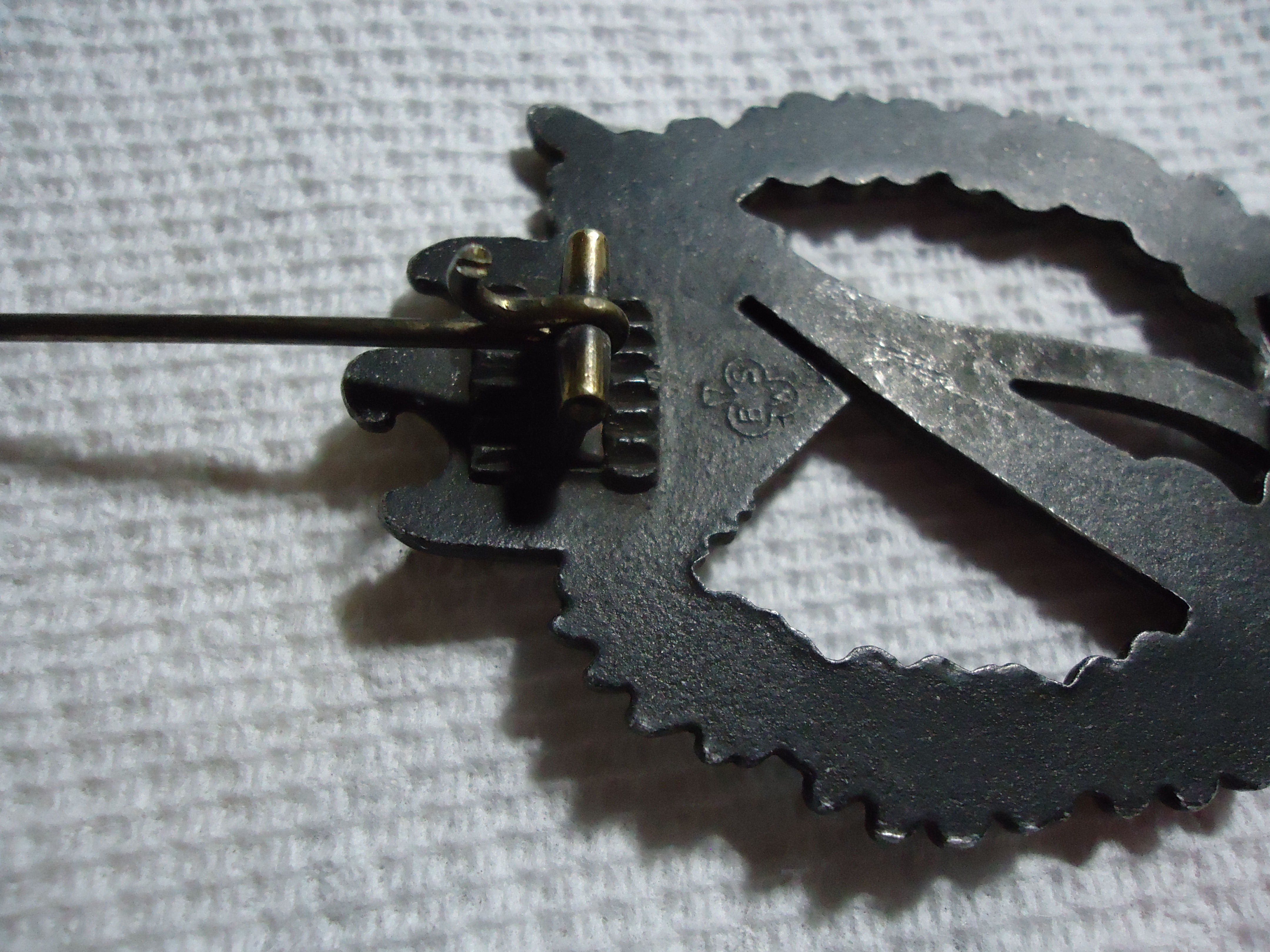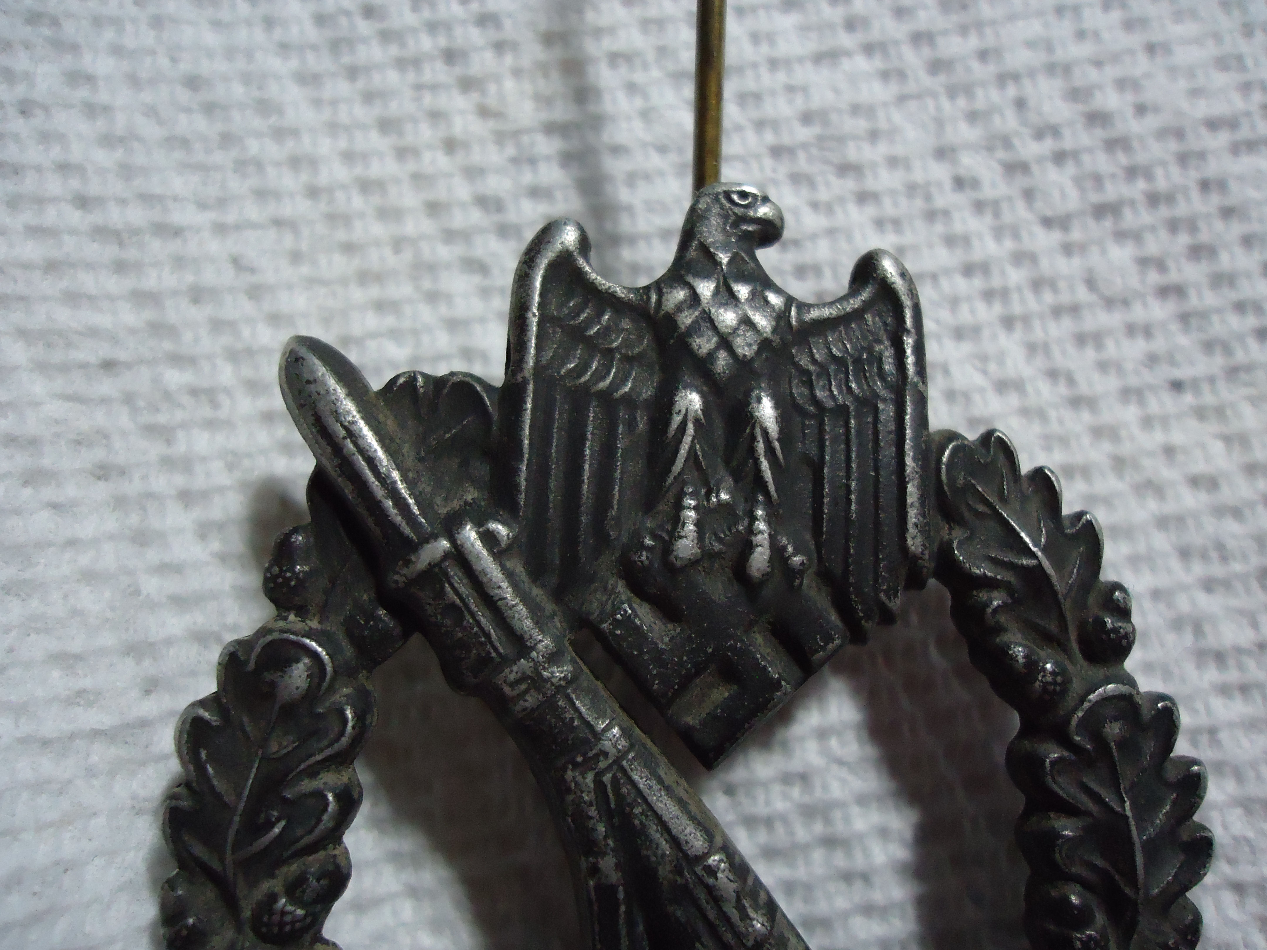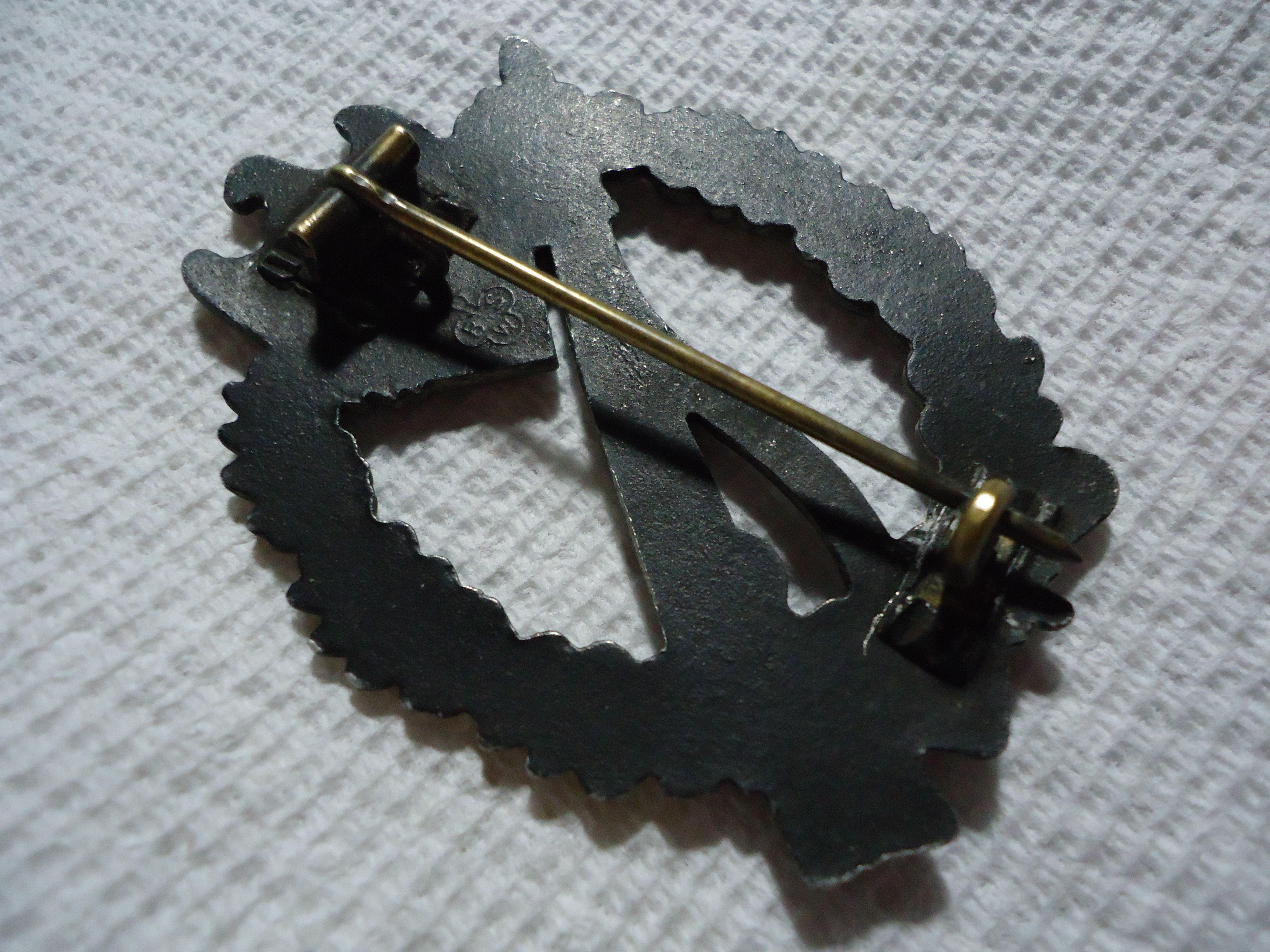 RARE Variation infantry assault badge marked BSW hinge and c hook on plate crimped in, silver version, age darkened light wear,