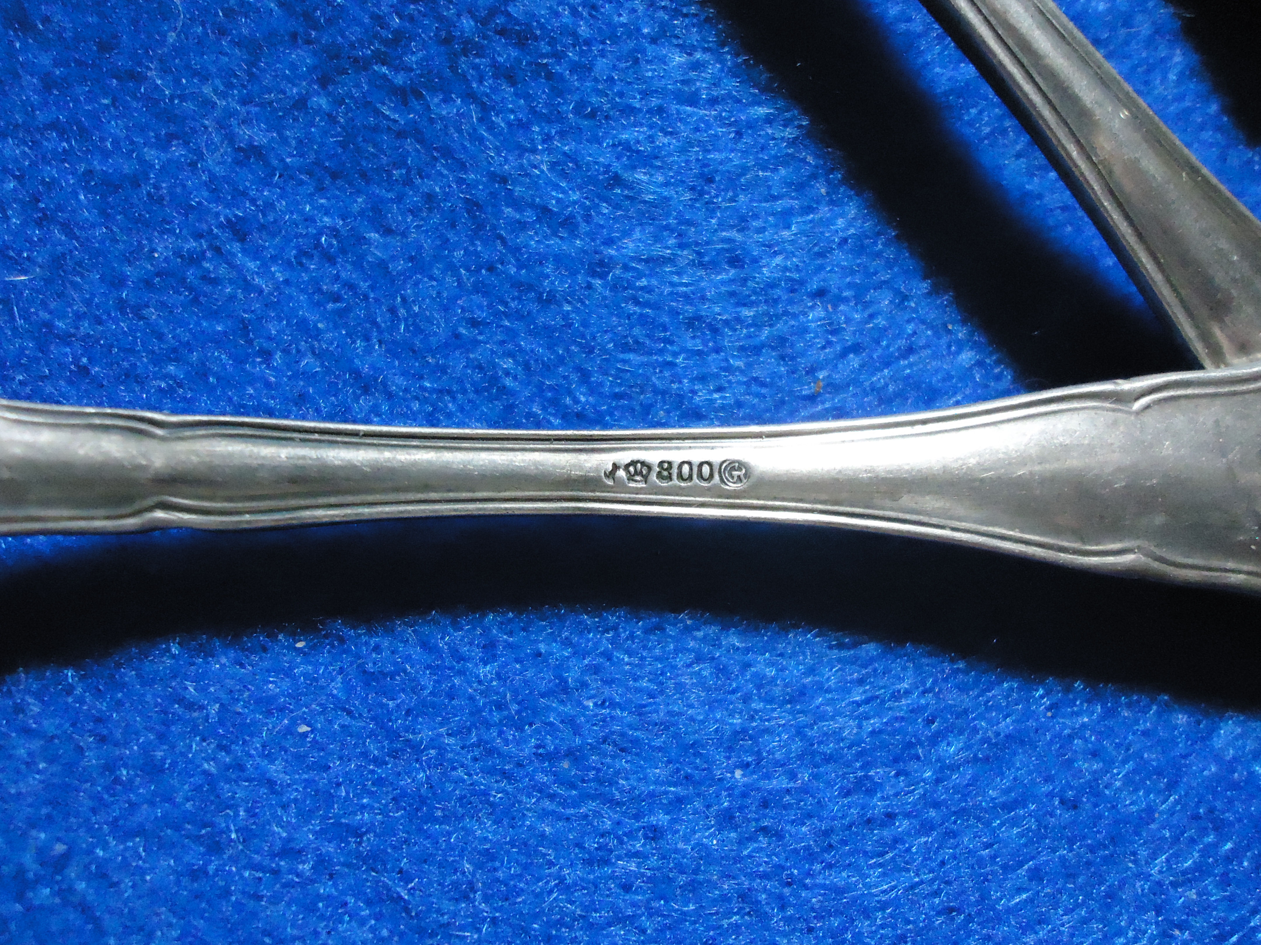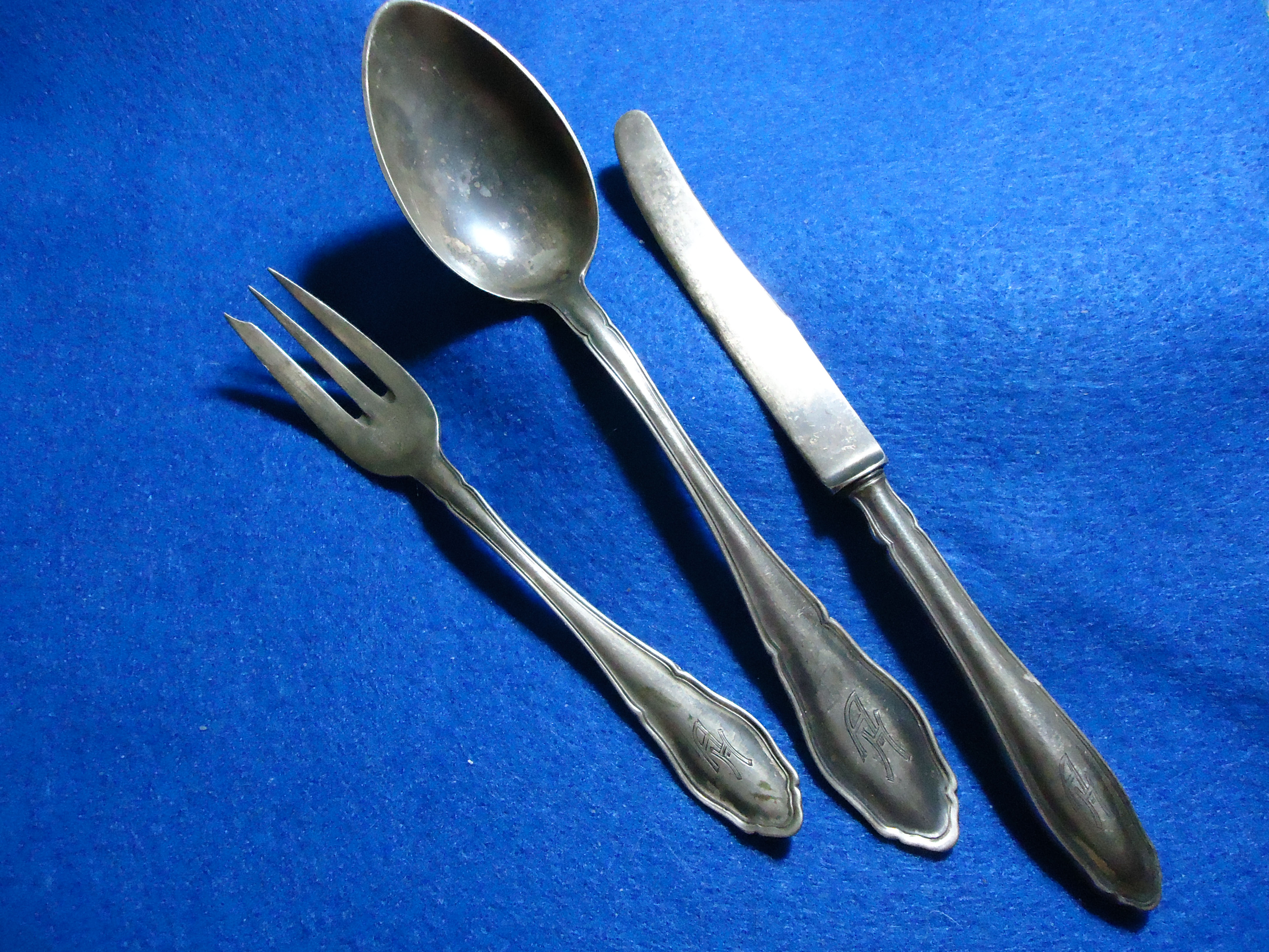 Adolf Hitler personal silverware, three pieces fork, spoon butter knife all same markings, 800 allegedly from DER DEUTSCHE HOF Hotel, good condition, monogram AH hand cut into handle,s
