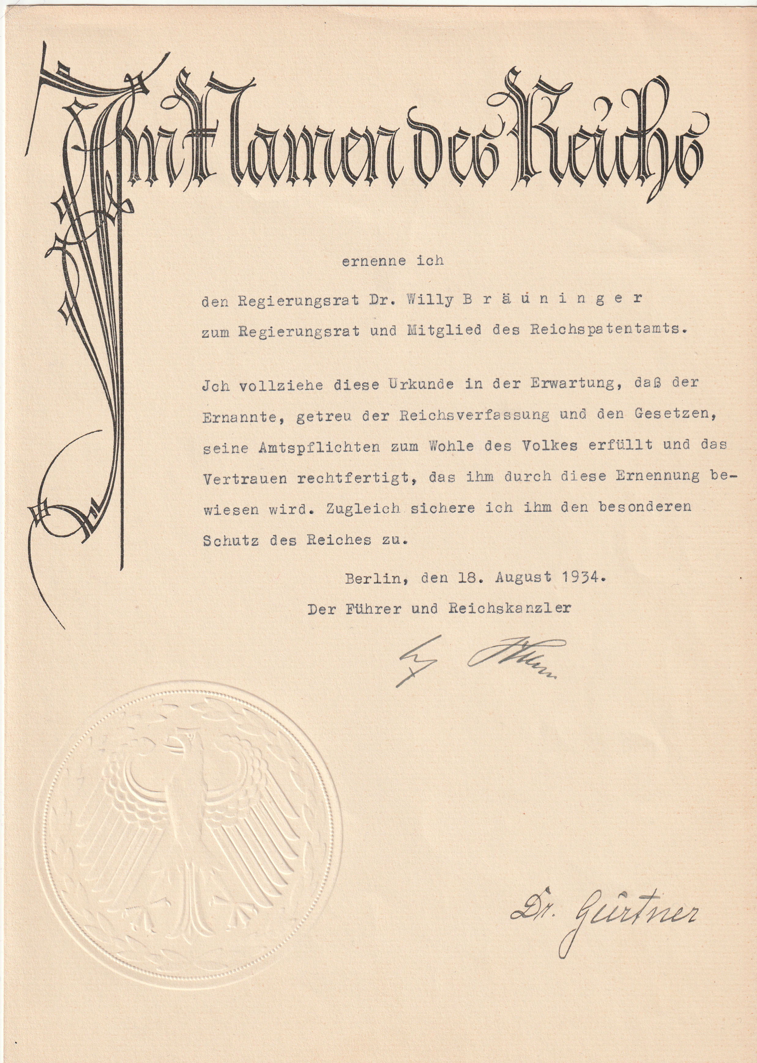 Original signature Adolf Hitler, ink signed, on certificate of appointment 1934 to the government advice and member of the Reich patent office of the chemist Dr. med. Willy Bräuninger , also signed in ink, DR. FRANZ GURTNER.