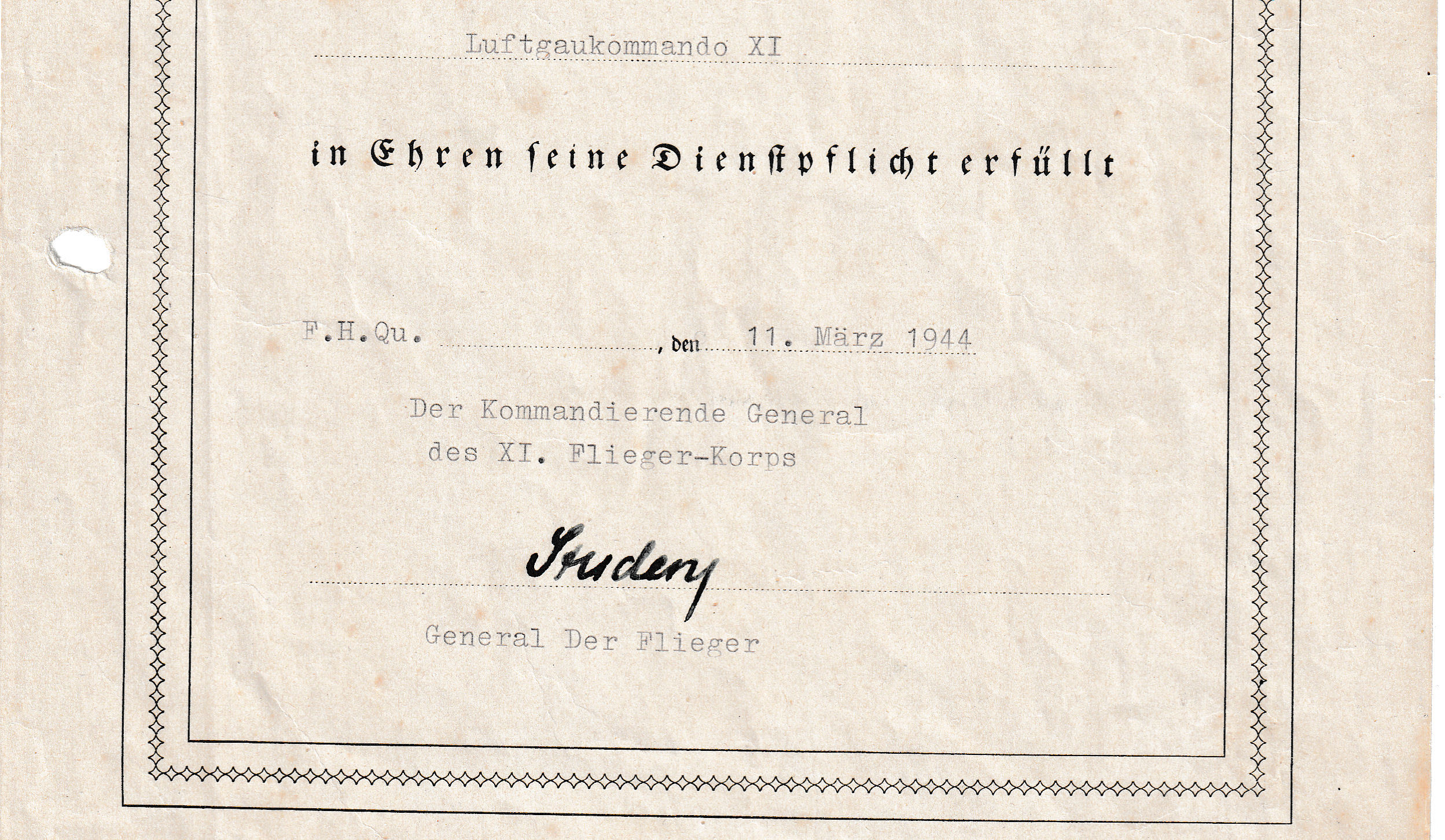 GEN/OBERST KURT STUDENT, SIGNED CERTIFICATE TO A OBERFELDWEBEL BERTHOLD WEITZE, DATED 11 MAR 44, CLEAN BOLD BLACK INK SIGNED -STUDENT- FINE