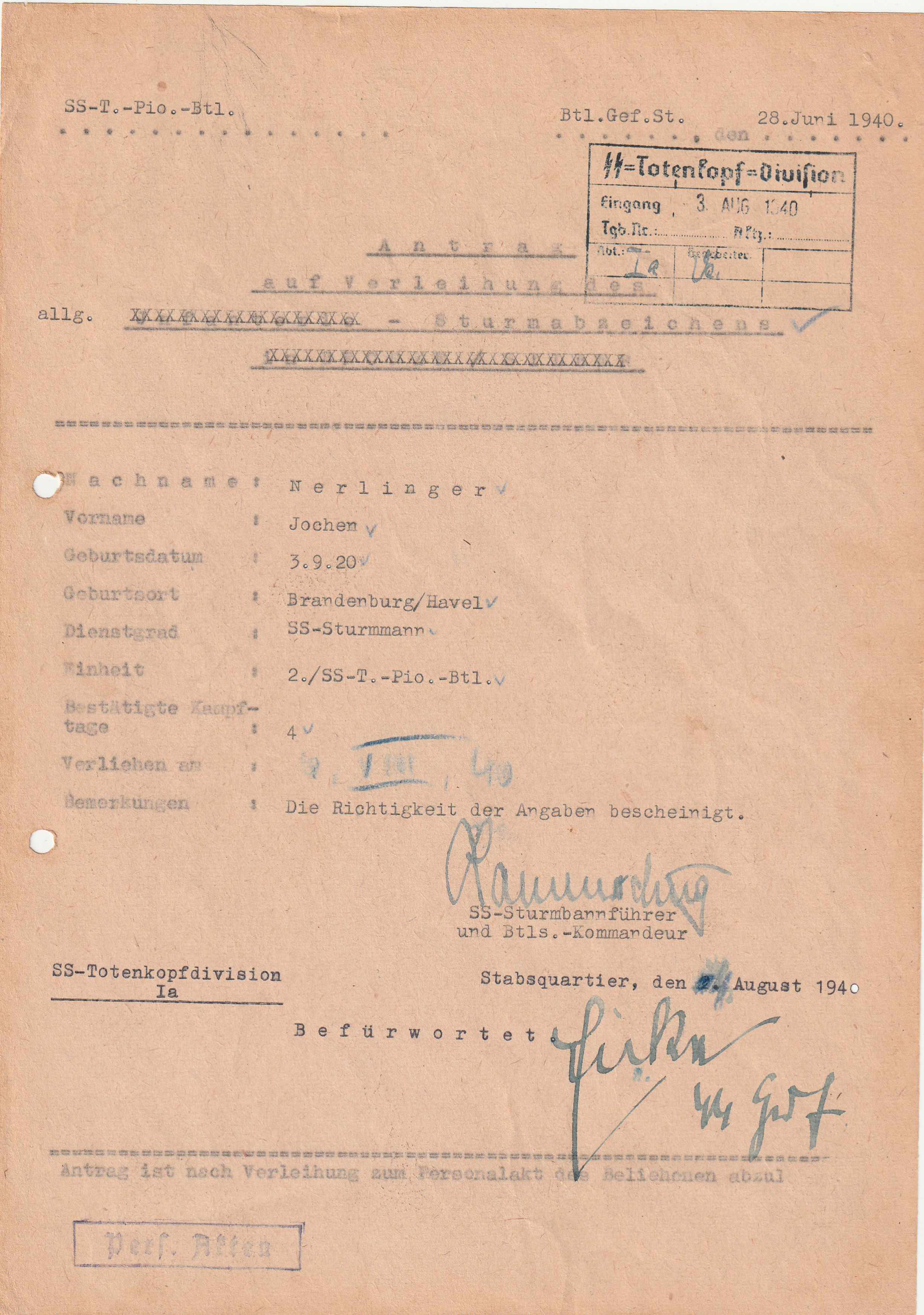 Application for the awarding of the general Sturmabzeichen for an SS-Sturmann of the SS-Totenkopf-Pionier-Bataillon.