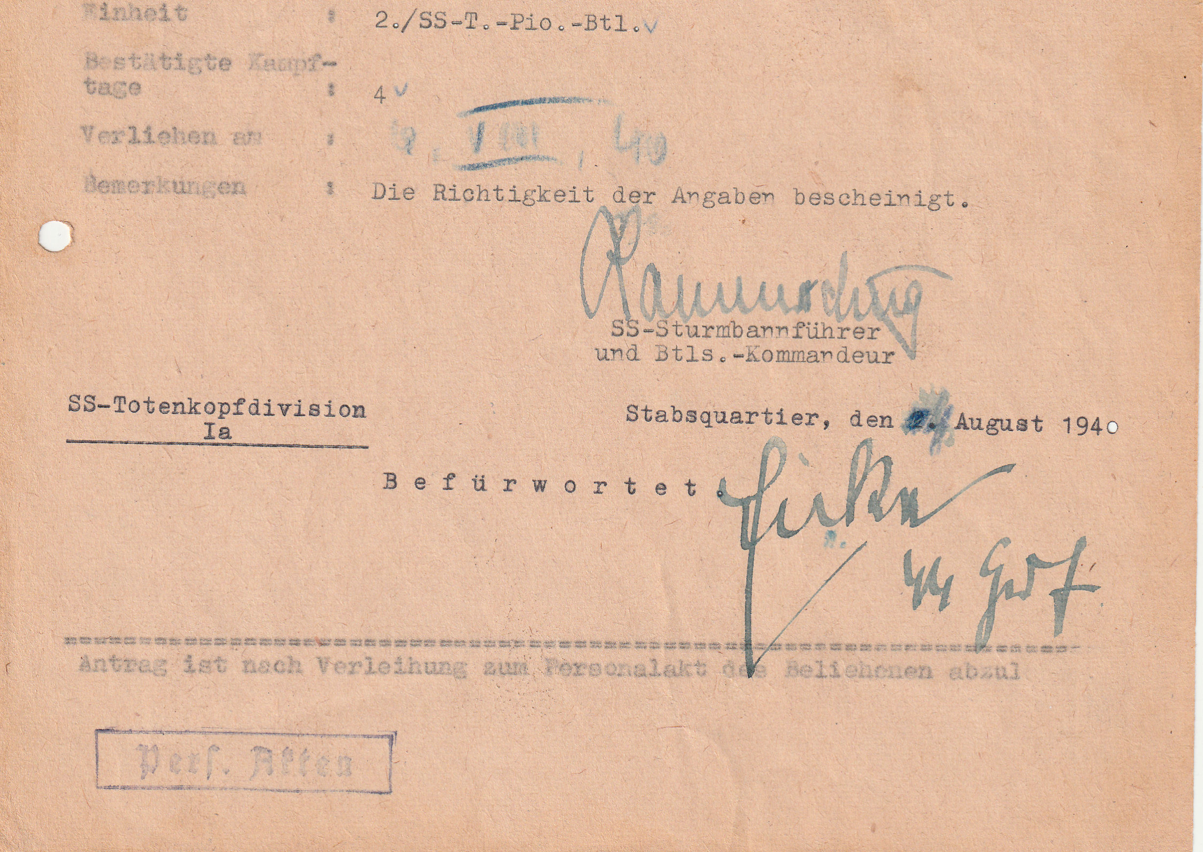 Typewritten, issued 28.6.1940, OU SS-Sturmbannführer u. Btls.Kdr. HB Lammerding (RK) and OU SS-Gruppenführer u. Div.Kdr. Theodor Eicke (RK, EL).